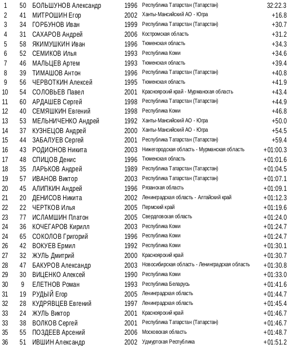 🌐 Республика Татарстан. Гор. Казань Гонка 15км СВ. Мужчины Мужская гонка ознаменовалась первой победой Александра Большунова в нынешнем сезоне Кубка России. При чём победа была достигнута в отличном стиле. Он раскрутился ближе к середине гонки, там же и создал решающий отрыв. Была заметна фирменная легкость и отличный настрой Большунова. «Хороший результат, я этому рад. Тренировки с родными приносят плоды. Поможет ли мне эта победа? Как пойдет, так пойдет, я не загадываю», — приводит слова Большунова ТАСС. Второе место с отрывом занял Егор Митрошин (+16,9), который уже стабильно в медалях. При чём конкурентен и в дистанции и в спринте. Работа в группе Бородавко даёт результат. Такая серьезная заявка на будущее. Иван Горбунов вырвал десятые доли у юниора Сахарова. Оба парня прошли с акцентом на финиш, но Горбунов оказался острее. Оба большие молодцы! Доминирующий же лидер сезона Сергей Ардашев боролся за медали на протяжении 2,5 кругов, но пару километров до ф