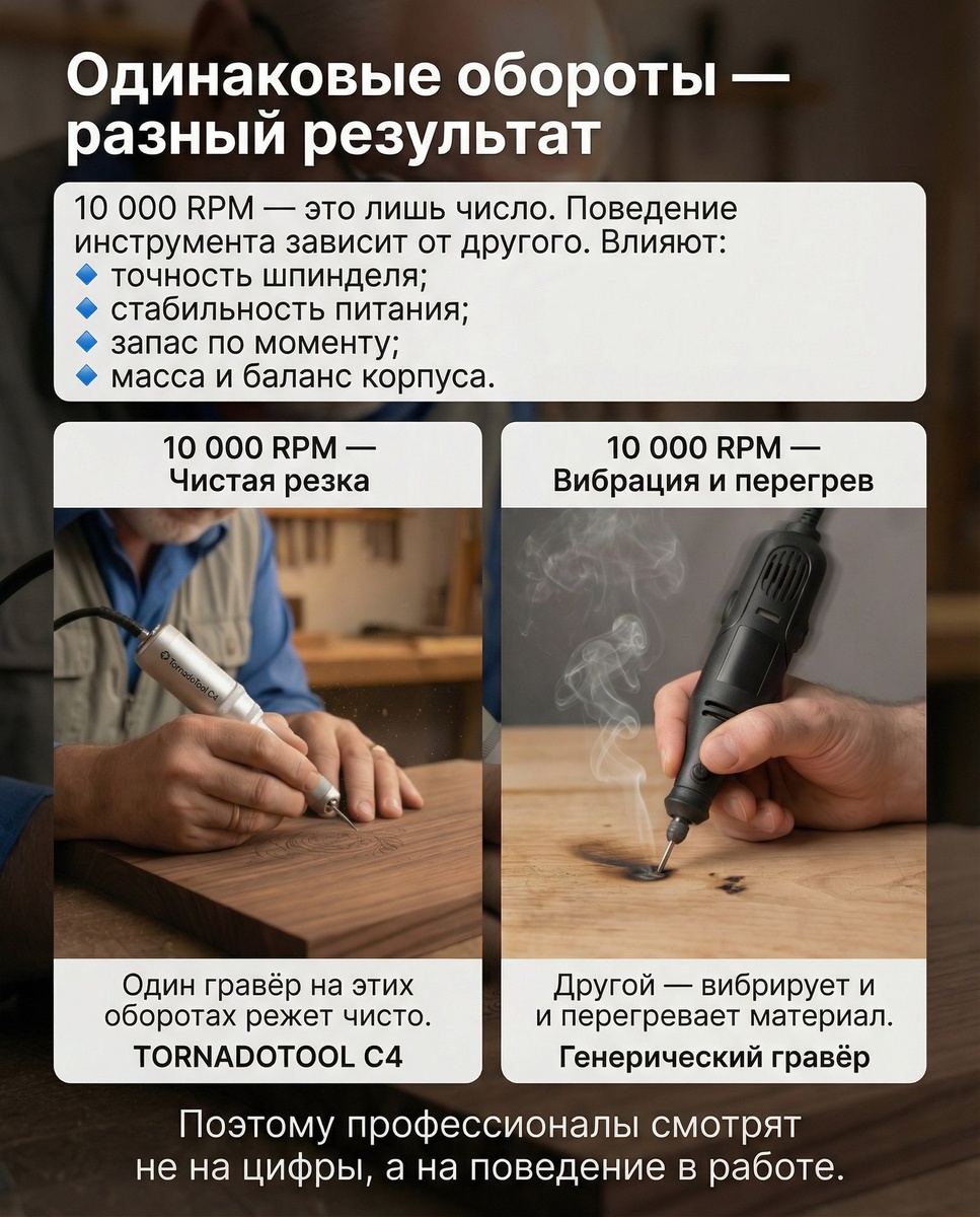 10 000 RPM — это лишь число. Поведение инструмента зависит от другого. Влияют: 🔹 точность шпинделя; 🔹 стабильность питания; 🔹 запас по моменту; 🔹 масса и баланс корпуса. Один гравёр на этих оборотах режет чисто. Другой — вибрирует и перегревает материал. Поэтому профессионалы смотрят не на цифры, а на поведение в работе.