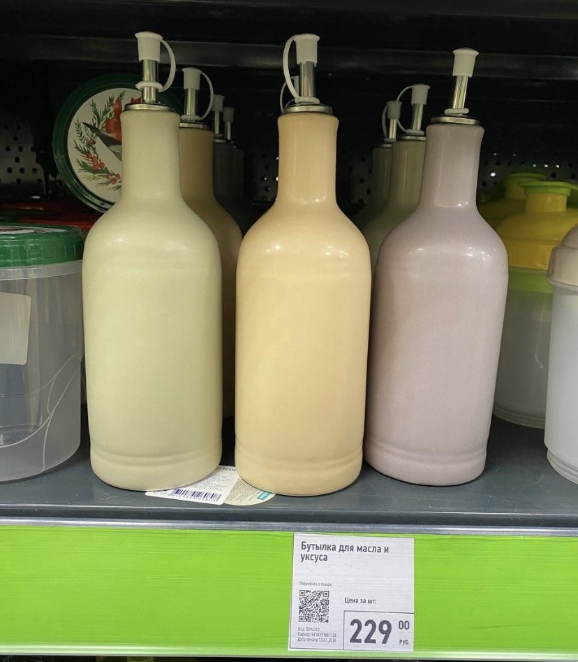 В наличии есть бутылка для масла и уксуса. Красивые нежные оттенки. Три варианта на выбор. Объем 490 мл. Красиво будет смотреться на рабочей поверхности кухни. Она изготовлена из керамики, нержавеющей стали, резины и полипропилена. Есть отметка о том, что ее нельзя мыть в посудомоечной машине. Производитель Китай. Стоимость 229 рублей.