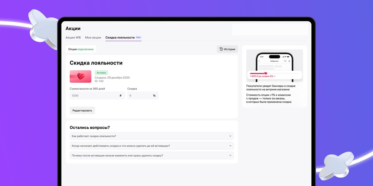За счёт продавцов WB начал тестировать инструмент «Скидка лояльности». Суть простая: продавец сам назначает персональную скидку для покупателей, которые за последние 365 дней выкупили его товары на определённую сумму. Можно задать: ✔ порог выкупа от 1 000 до 100 000 ₽, ✔ скидку от 3% до 50% на весь магазин. Когда покупатель достигает порога, он видит подсказку о доступной скидке именно у этого продавца. Подключается через конструктор тарифов, работает минимум 30 дней, с другими скидками не суммируется. Теперь моё мнение. Это не программа лояльности WB. Это программа лояльности за счёт селлеров. Маркетплейс не даёт ни трафика, ни бонусов, ни софинансирования. Он просто предоставляет интерфейс, а скидку оплачивает продавец целиком. По сути, это ещё один способ аккуратно сказать: хочешь повторные продажи — снижай цену сам. Да, для брендов с высокой повторяемостью это может иметь смысл. Но для большинства селлеров это либо минус к марже, либо формальность, которую включат «потому что