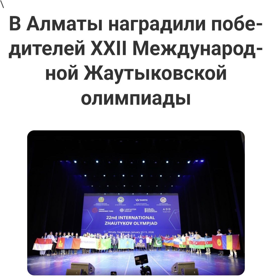В Алматы завершилась XXII Международная Жаутыковская олимпиада. Первое и второе места заняли школьники из РФ, третье поделили с казахстанцами. Министерство просвещения Казахстана опубликовало итоги XXII Международной Жаутыковской олимпиады. Состязания по по математике, физике и информатике проходили с 10 по 15 января. Всего в олимпиаде приняли участие 612 школьников и 122 руководителя команд из 16 стран. Это такие государства, как: Казахстан, Россия, Беларусь, Индия, Грузия, Болгария и другие. "Соревнования проходили в два тура. Задания были разработаны в соответствии с программами специализированных классов и подготовлены международным жюри, в состав которого вошли признанные специалисты мирового уровня", - сообщили в ведомстве. По итогам олимпиады 70 школьников были награждены золотыми медалями, 96 — серебряными и 158 — бронзовыми. Всего вручили 324 медали. Также были отмечены команды, показавшие высокие результаты. Первое место и звание "Лучшая олимпиадная команда" получила команд