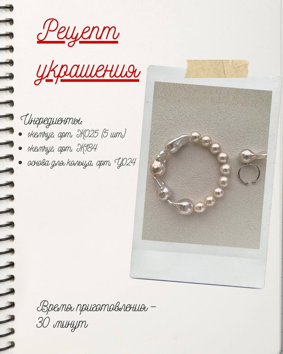 Продолжаем нашу творческую рубрику и сегодня приготовим браслет и колечко с жемчугом✨ Основные ингредиенты — Жемчуг, арт. Ж025 (5 шт) — Жемчуг, арт. Ж184 — Основа для кольца, арт. У024 Дополнительные ингредиенты — Силиконовая резинка для браслетов, арт. ПР04 — Эпоксидный клей, арт. И29 Может понадобиться — Микродрель, арт. И108 Рецепт: На спандекс аккуратно нанизываем жемчужины, ориентируясь на обхват запястья. Завязываем крепкий узел. Для надёжности фиксируем его маленькой каплей клея. Для приготовления кольца сделаем отверстие в боковой части жемчужины с помощью микродрели. С помощью клея крепим жемчужину к основе для кольца. Готово 💫 Минимум шагов, много эстетики и украшения, которые легко станут любимыми.
