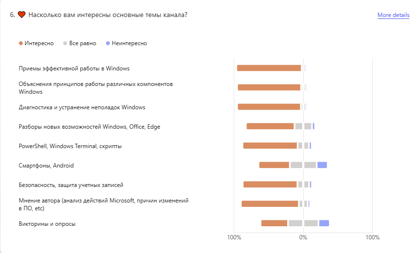 ) На декабрьский опрос откликнулось 320 человек. Спасибо всем, кто уделил время! Сегодня я публикую выдержки из количественных результатов и мои комментарии к ответам на вопросы в свободной форме. 🔢 Ответы в цифрах Как вы оцениваете сложность технических постов канала? Половине всё понятно. А ещё 42% канал помогает разобраться. Отлично! Читали ли вы посты, опубликованные в канале до того, как вы подписались? Этот вопрос видели только подписчики со стажем не более года. 2/3 как минимум просматривает старые посты. Это радует! Сам я читаю ретроспективно новые для себя каналы. Не за всю историю, но могу глубоко вверх уйти. Как вы относитесь к идее иногда заново публиковать не новые, но вполне актуальные технические советы и хитрости? Я ожидал вашу поддержку, но не 98% 👏 Было пожелание актуализировать контент, нежели просто копировать. Так и задумано. Насколько вам интересны основные темы канала? Расклад на картинке↓ Для меня всё более-менее ожидаемо кроме опросов/викторин, о них н