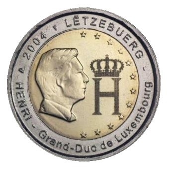На монете изображен профиль Его Королевского Высочества, Великого Герцога Анри. Герцог Анри правил Люксембургом с 7 октября 2000 года после отречения от престола его отца Жана, до 3 октября 2025 года, когда он отрекся от престола в пользу своего сына Гийома. Справа от профиля Герцога Анри изображена личная монограмма Герцога. Монограмма сочетает в себе личный и государственный символизм: Монограмма служит официальным персональным знаком великого герцога и используется в следующих случаях: Впервые личная монограмма Великих Герцогов Люксембурга была размещена на монетах в 1924 году, когда были выпущены монеты номиналом 5,10 сантимов, 1 и 2 франка с личной монограммой Великой Герцогини Шарлотты. Изображение Его Королевского Высочества, Великого герцога Анри на левой стороне монеты, обращенной вправо, и монограмма Великого герцога Анри (особая буква "H", увенчанная короной) справа. Справа от монограммы - 12 звезд, расположенных полукругом вокруг внутреннего кольца. Год 2004, окруженный кл
