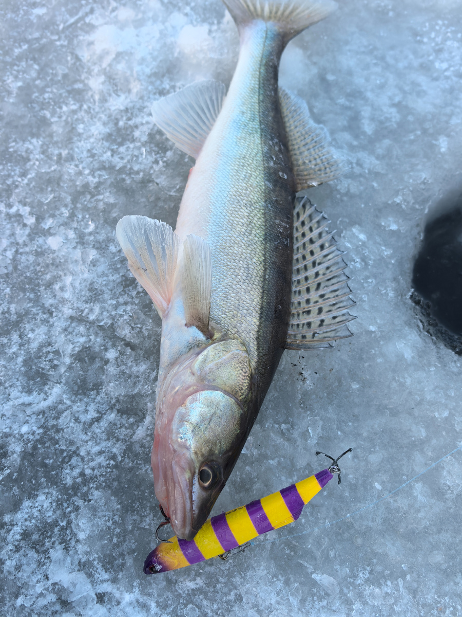 Накануне была совершена тактическая ошибка, о которой я писал в прошлом отчете, но самое главное, что парни нашли колючую рыбу в количестве, а это значит 8 января мы с самого утра встаем на ее скопление. Нас сегодня много, человек 10, если не больше. Занимаем пятак, разбуриваем и начинаем ловлю. Старший Андрей решил проверить другую точку и ушел далеко, вернулся потом с двумя прозрачными хвостами в активе, когда у нас все заткнулось уже, но это было потом, а сейчас мы начинаем ловлю. Мне захотелось погонять вибы от компании Mottomo, а именно Blade VIB Slim 105 и 125S. В ящике лежит еще с прошлого сезона штук 8 нераспакованных приманок, которые прислали на тесты под конец льда и лишь некоторые успел погонять на 1-2 рыбалках 25 года в марте. По сумеркам рыб ползал, но не клевал, но как только рассвело, началась чехарда, когда подлетает по 3-4-5 рыб сразу. Но даже в период такой активности работают не все приманки. PAL03 молчал, а вот желто-фиолетовый в 125 росте сразу же начал давать пок