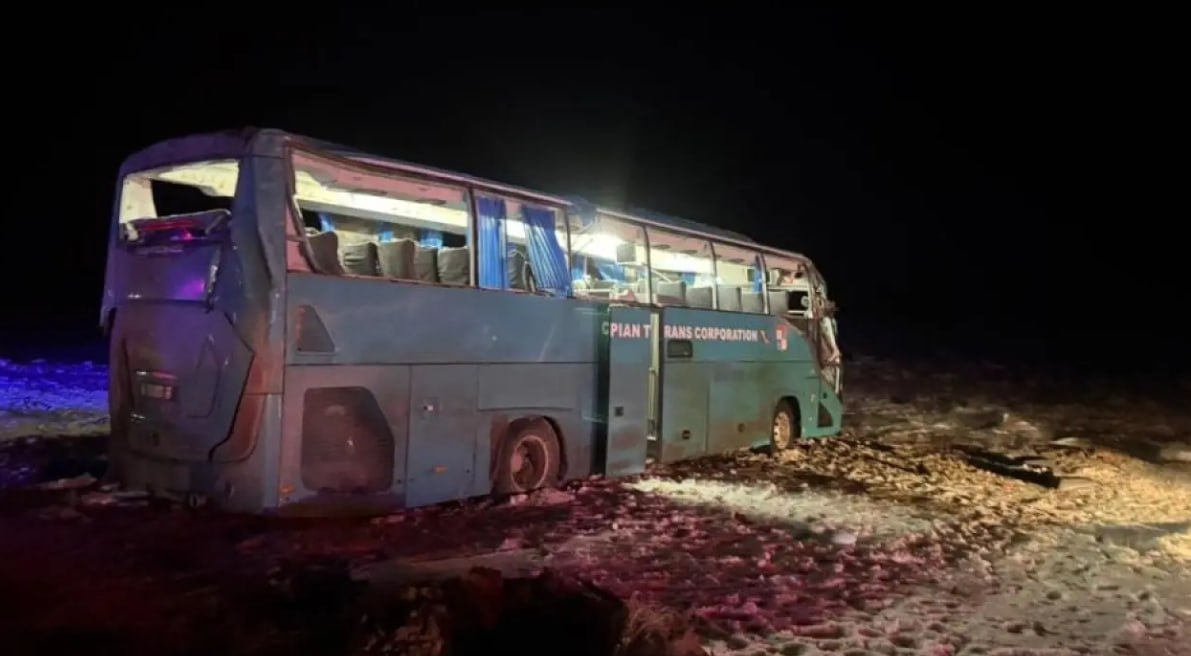 Авария случилась в ночью, 16 января, на 383-м километре трассы KZ-11 «Доссор – Кульсары – Бейнеу – Сайотес – Шетпе – Жетыбай – Актау». "Четыре человека скончались на месте происшествия, ещё 42 пассажира получили различные телесные повреждения. 17 из них госпитализированы, остальных отправили на амбулаторное лечение", – сообщили в пресс-службе Департамента полиции Мангистауской области. По предварительным данным, водитель автобуса Yutong, двигаясь из Актау в сторону села Бейнеу, не справился с рулевым управлением. Возбуждено уголовное дело. Водитель автобуса задержан. Фото: Министерство транспорта РК t.me/CMN_KZ