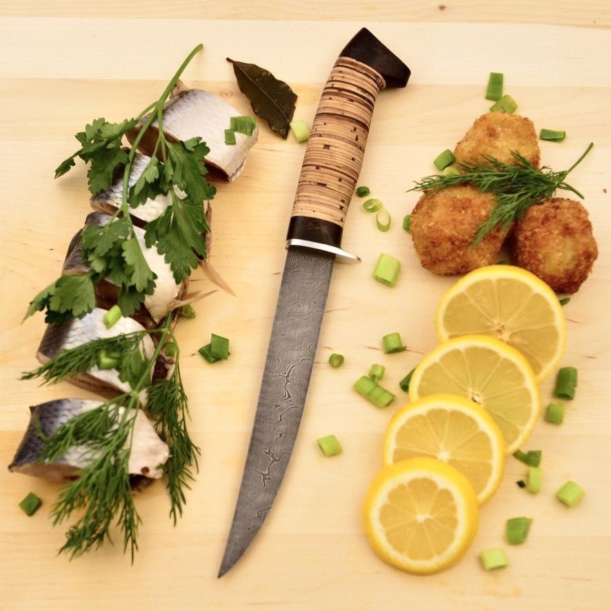 Филейный нож Судак средний, сталь Дамаск,рукоять береста, венге