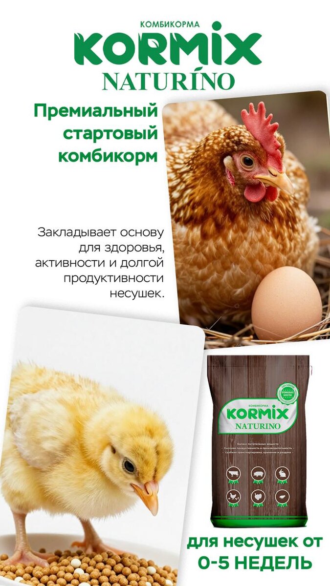 ! 🐔 С самого первого дня (0–5 недель) и на протяжении всего периода выращивания этот комбикорм станет надежной основой для здоровья и яйценоскости ваших кур. ✅ Сбалансированное питание — поддерживает рост, развитие и крепкий иммунитет. ✅ Высокая продуктивность — до 320 яиц в год! 💪 ✅ Удобная упаковка — легкое хранение и использование. 🚨💧 Важное напоминание: круглосуточно поддерживайте доступ к чистой свежей воде! Купить здесь и OZON 🖱 Дайте своей птице старт с Kormix Naturino! 🌱 #KormixNaturino #КормДляНесушек #Яйценоскость #ЗдоровьеКур