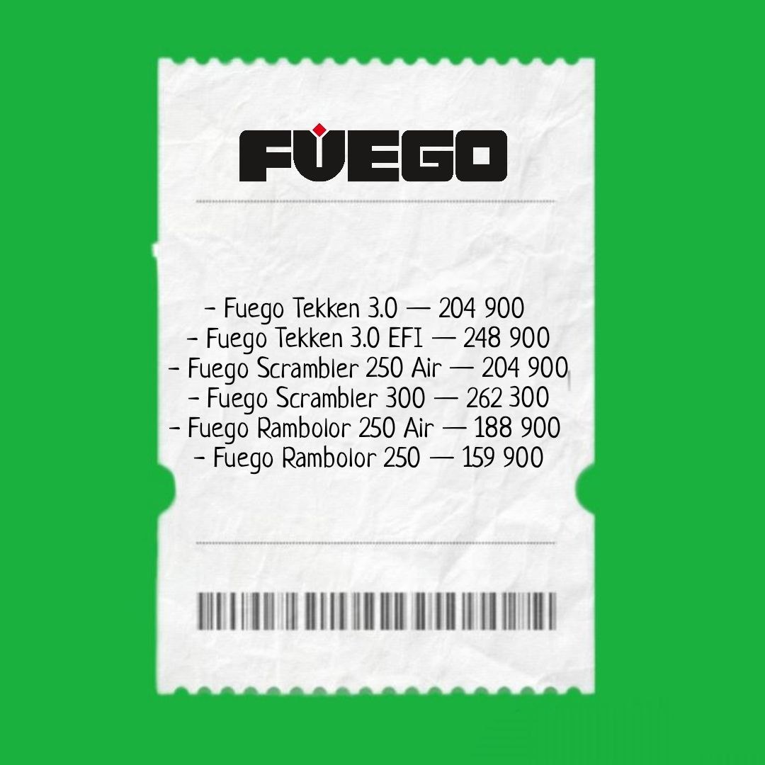 максимально доступными. Посмотреть технические характеристики каждой модели или найти ближайшего дилера можно на нашем официальном сайте: Fuego-power.ru - Fuego Tekken 3.0 — 204 900 руб. - Fuego Tekken 3.0 EFI (инжектор) — 248 900 руб. - Fuego Scrambler 250 Air — 204 900 руб. - Fuego Scrambler 300 — 262 300 руб. - Fuego Rambolor 250 Air — 188 900 руб. - Fuego Rambolor 250 — 159 900 руб.