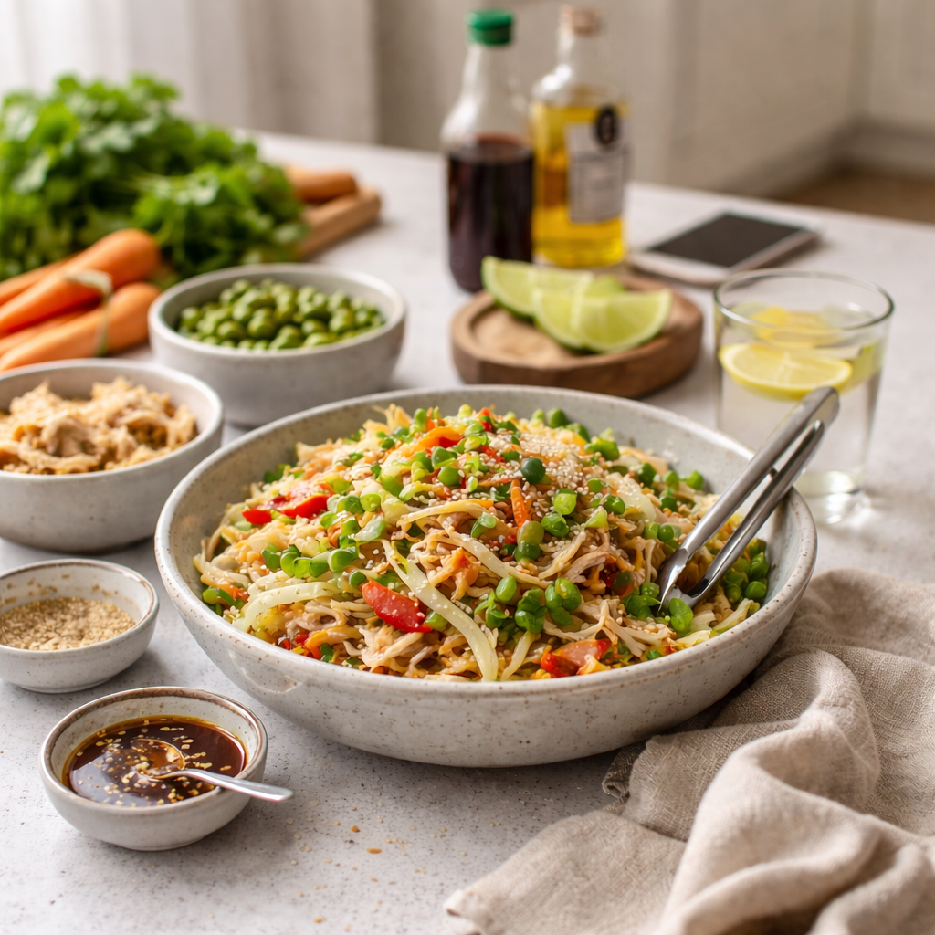 Это был вечер из тех, что начинаются словами: «Я просто быстро что-нибудь соберу». Понедельник. После работы. Дети кружат, как чайки. У меня в голове шум. В руках телефон. В холодильнике — курица «на потом» и овощи, которые смотрят с укором. Я честно пыталась. Открыла ноутбук. Закрыла. Поставила чай. Забыла про него. И в какой-то момент просто села на пол кухни. Прямо так. Спина к шкафу. И подумала: «Мне нужен ужин, который не требует подвигов». И тут — щёлк. Я вспомнила одну статью, сохранённую сто лет назад. Про холодный салат. С лапшой. Без разогрева. Такой, знаешь, из серии «достал — и жизнь наладилась». Режим «маховик времени» активирован. Вода кипит. Лапша варится. Я режу морковь. Сын таскает её сырую. Дочь макает палец в соус и говорит: «Ммм». Муж внезапно появляется с фразой: «О, тут что-то интересное». Кухня оживает. Как в ситкоме. Только без закадрового смеха — зато с настоящим. Мы ели молча. А потом все одновременно сказали: «А можно завтра такое же?» И вот в этот момент я п