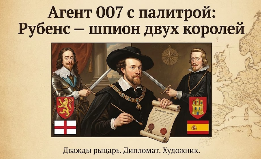 Мы привыкли думать о Питере Пауле Рубенсе как о художнике, который любил рисовать пышнотелых дам и пухлых купидонов. Но мало кто знает, что за мольбертом скрывался настоящий Джеймс Бонд XVII века. Знаменитый фламандец был не просто живописцем, а хитроумным шпионом и дипломатом высокого ранга. И да, вы не ослышались: он единственный художник в истории, которого посвятили в рыцари сразу два короля, находившихся в состоянии войны друг с другом! Как ему это удалось? Давайте разбираться. Представьте Европу первой половины XVII века. Идет Тридцатилетняя война, все воюют против всех. Границы закрыты, послы высылаются, а шпионов казнят. Но есть один человек, которому рады везде. Рубенс мог спокойно пересекать границы вражеских государств. Зачем? "Я еду писать портрет короля!" — говорил он. И его пропускали. Пока он рисовал монархов и вельмож, он слушал их разговоры, оценивал настроение двора и передавал секретные письма. В конце 1620-х годов Испания и Англия были заклятыми врагами. Никто не хо