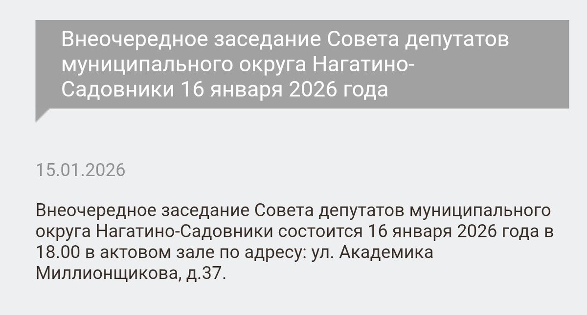 адресу: ул. Академика Миллионщикова, д.37. #велопатрульНС #НагатиноСадовники #депутаты https://n-sadovniki.ru/all_news/ob_yavleniya/vneocherednoe_zasedanie_soveta_deputatov_municipalnogo_okruga_nagatinosadovniki_16_yanvarya_2026_goda/