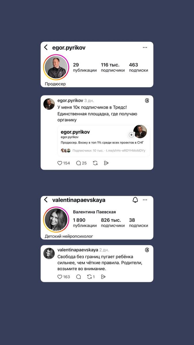 И это не кликбейт 😁 Вот, знаете, я хотела сегодня написать сильный пост со смыслами, зачем вам ко мне в клуб, зачем вам идти в тредс, прям все расписать подробно, кейсами блеснуть там. Вон смотрите, даже скрины топов рынка подготовила, чтоб показать какие они мощные в инстаграм и какие маленькие в тредс. В Тредс они нам вообще не конкуренты, посмотрите на количество лайков или комментариев) Ну то есть путь свободен – заходите и занимайте свою нишу, становитесь сами топом) Но я уже выполнила план продаж, поэтому больше ничего писать не буду и это последний пост Что важно: 🔵Эфир удалю сегодня в 16:00 по мск (ЭФИР УДАЛЕН) 🔵Получить в подарок к клубу +1 неделю можно до 14:00 сегодняшнего дня (все кто оплатит позже, подписка будет на 30 дней) (АКЦИЯ ЗАВЕРШЕНА) 🔵Продажи закрою в субботу в 20:00 по мск Кстати, Яна тоже зашла на челлендж, а ребята еще до старта челленджа офигевают от тредс, что он уже им приносит результат) Ждем всех желающих, пока есть возможность ⬇ ПРОДАЖИ ЗАКРЫ