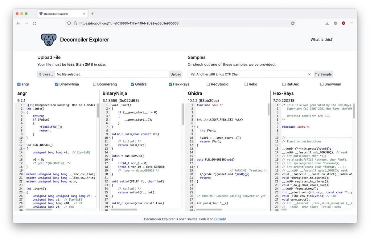 ⚒️ Decompiler Explorer — это веб-интерфейс для работы с разными дизассемблерами и декомпиляторами, позволяющий сравнивать результаты их