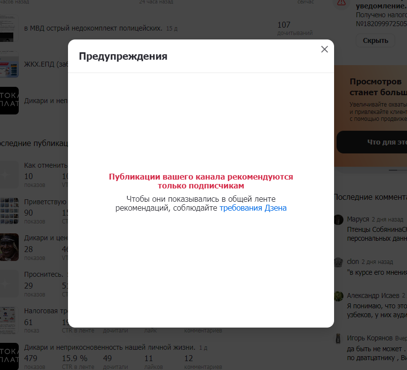 решил вывести мой канал из своей же блокировки и стал потихоньку, неспеша, по чуть-чуть показывать мои материалы в общей ленте Дзена, как та-дам! Дзен СНОВА МЕНЯ ЗАБЛОКИРОВАЛ. Что это было-то? Акт доброй воли в надежде, что я куплюсь на монетизацию в 2,8 рубля за три дня показов Дзеновской рекламы в моих статьях и стану послушно исполнять волю алгоритмов Дзен в угоду хозяевам Дзена Кириенкам? - смешные. Они мне выдвигают ТРЕБОВАНИЯ ДЗЕНА, а я им - выдвигала ТРЕБОВАНИЯ СОБЛЮДЕНИЯ НАШИХ ПРАВ. Как видите, наши права им неинтересны. И снова публикации моего канала ОПЯТЬ видны только подписчикам. Не теряйтесь, дорогие подписчики! ... пысы. даже, не смотря на то, что Дзен "выпустил в свет", лишь, некоторые мои материалы, за эти несколько денечков