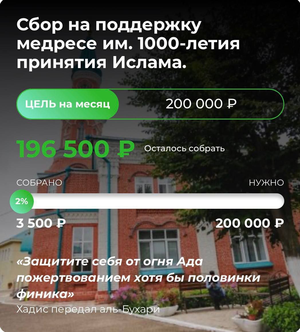 Открыт ежемесячный сбор на поддержку одного из ключевых центров исламского образования. 📖Медресе им.1000-летия принятия Ислама — классическое татарское медресе, где знание всегда шло рядом с воспитанием. Исторически такие медресе держались на поддержке общины и меценатов, понимавших: без заботы об устазах невозможно сохранить веру и преемственность. И сегодня эта ответственность лежит на нас. 🎯Цель сбора — 200 000 ₽. 🔗Поддержать: https://medrese-1000-kazan.ru/?ref=29560409 🌱Отдавая ради Аллаха, мы не теряем, мы сохраняем.