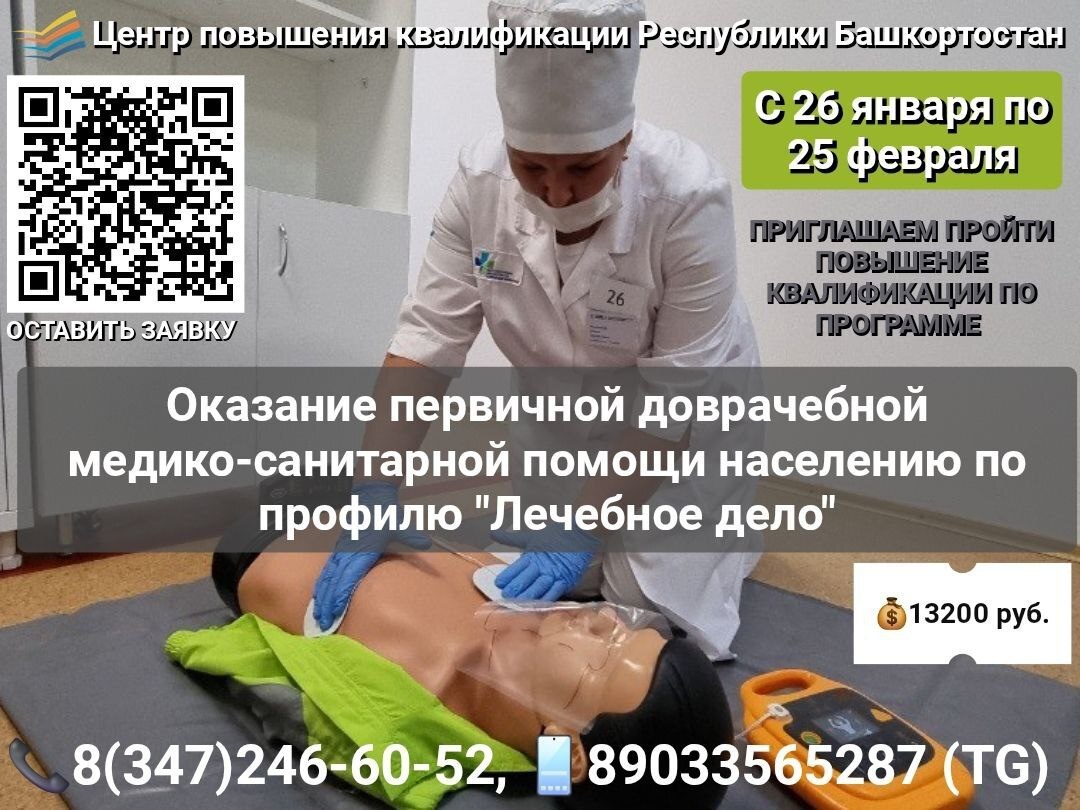 по 25.02.2026 г. Центр повышения квалификации предлагает пройти повышение квалификации по актуальной программе: «Оказание первичной доврачебной медико-санитарной помощи населению по профилю «Лечебное дело». 🎓Целевая аудитория: средние медицинские работники, имеющие базовое образование по специальности «Лечебное дело». 📃По окончании выдается документ установленного образца с внесением данных в Федеральный реестр документов об образовании (ФИС ФРДО). 💰Стоимость обучения: 13 200 руб. 💻Заявки на обучение можете оставить на нашем сайте: https://clck.ru/3NMcvR 📞Контактный телефон: 8(347)246-60-52, 89033565287 (телеграм).
