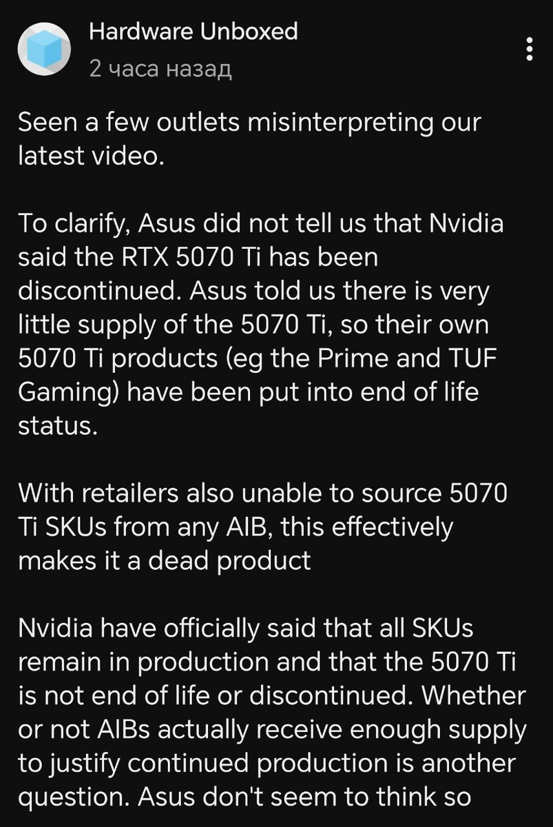 Производство RTX 5070 Ti не свёрнуто. Просто Hardware Unboxed "неправильно поняли".