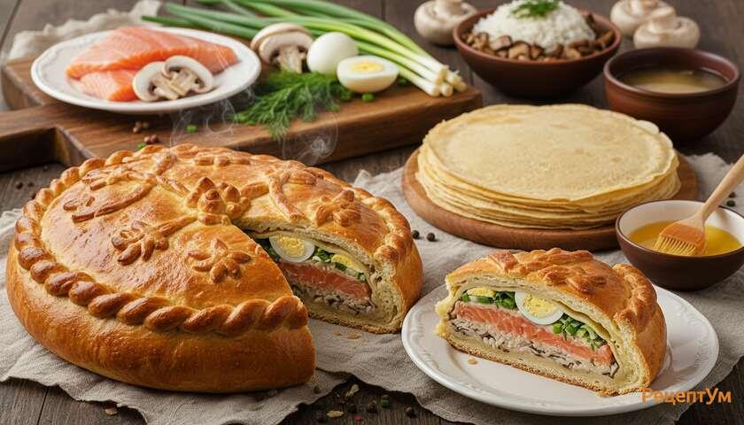 История блюда: кулебяка упоминается в русских источниках с XVI века и считается одним из самых сложных и торжественных пирогов русской кухни. Её готовили на свадьбы, именины и большие праздники. Классическая кулебяка отличается от обычных пирогов многослойной начинкой, разделённой блинами.