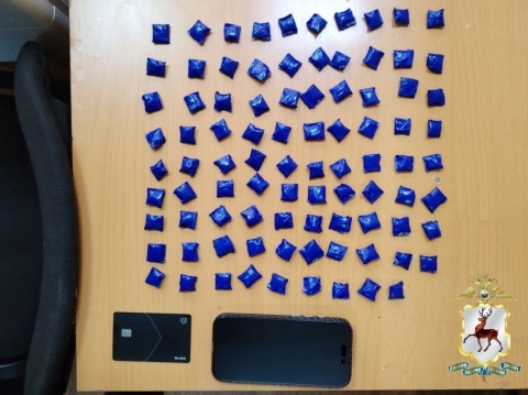 Для установления личности 20-летний мужчина был доставлен в отдел полиции № 8 УМВД России по Нижнему Новгороду. В ходе личного досмотра во внутреннем кармане его куртки оперативники обнаружили и изъяли 89 свёртков, обмотанных синей изолентой.