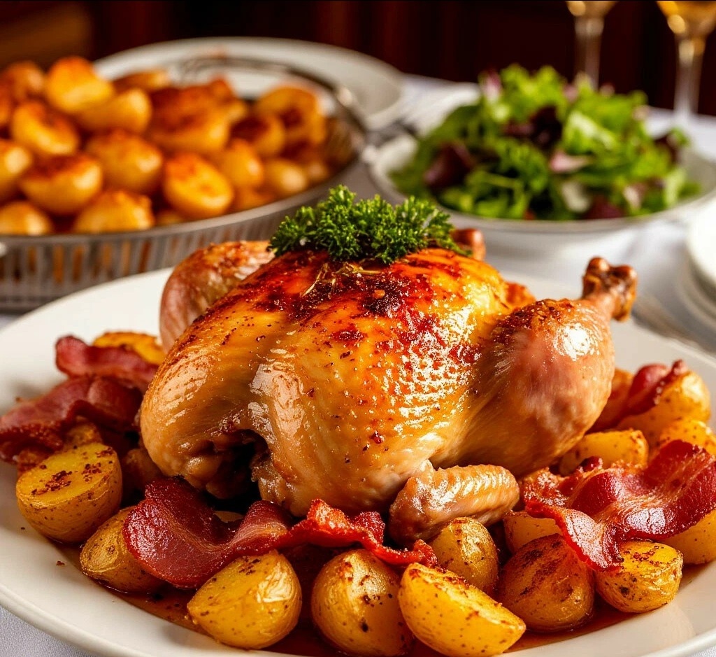ПОЧЕМУ ЭТО ШЕДЕВР? 🎨 Сочетание сладковатой куриной кожицы,дымного хрустящего бекона и картофеля, запеченного в чесночно-розмариновом масле, — это абсолютный хит паба.