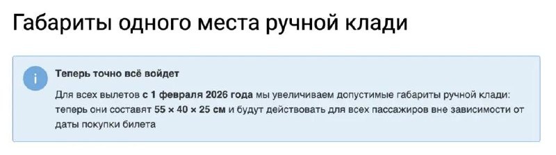 Вместо разрешенных ранее 55 × 40 × 20 будет 55 × 40 × 25 сантиметров. Новые правила начнут действовать с указанной даты, но коснутся всех пассажиров сразу, вне зависимости от даты покупки билета и городов вылета. Вес ручной клади остается прежним, до 10 килограммов для тарифов «Эконом» и до 15 — для бизнес-класса. https://bg.ru/bg/city/city-news/31017-ural-bagage ❤️ «Большой Город»