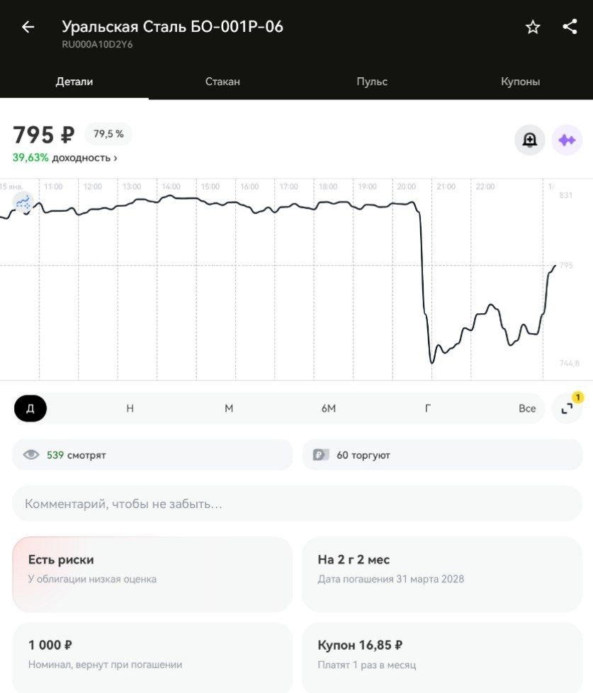 Новый эпизод сериала Уральская Сталь. Скрытая угроза Теперь блокировка счетов на 1.4 ярда Утром якобы блокировка пропала и облигация начала отрастать. На форумах бытует мнение, что собрать деньги на гашение было сложно, поэтому не платили всем - и поставщикам и даже ФНС. Поэтому подобная блокировка за неуплату бюджету не последняя Ну а если вы уверены, что дефолта не будет - это шанс взять пониже. (с) Сосбух @sosisochnayagazeta