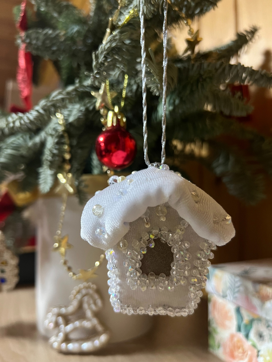 Елочная игрушка по МК А. Пеях. Я все еще их вышиваю, и все еще не сделала этот домик по мах. Технологию немного упростила, мне они нужны были побыстрей на подарки. У Ангелины он более сложный. Я упростила создание крыши, у Ангелины она сделана методом сухого валяния шерсти, а я взяла поролон. Обернула его белым бархатом, специально сделала несколько протяжек, что бы с одной стороны крыши сделать выемки, наплывы снега, сугробы, складки не выравнивала, они тоже имитация снежного сугроба... Домик состоит из 6 деталей. Он 3 D игрушка. У меня достаточно плотный фетр в основе, поэтому стенки не укрепляла ничем, хорошо держит форму. Можно, даже нужно по МК укрепить стенки проволокой, вшить изнутри. Окошко заклеено кусочком белого фатина. В процессе украшений использованы приемы плетения. Я не все украшения создала, еще раз повторюсь у Ангелины он более красивый и сложный... Очень советую мастер классы Ангелины Пеях.