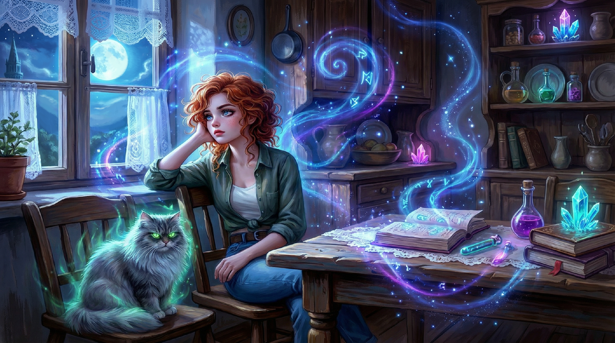 Тем временем Алиса и понятия не имела о назревающем «заговоре». Она сидела на кухне, пытаясь расшифровать рецепт какого-то зелья из книги тети Агаты под названием «Отвар для ясности ума». Платон, свернувшись калачиком на стуле, снисходительно наблюдал за ее мучениями.