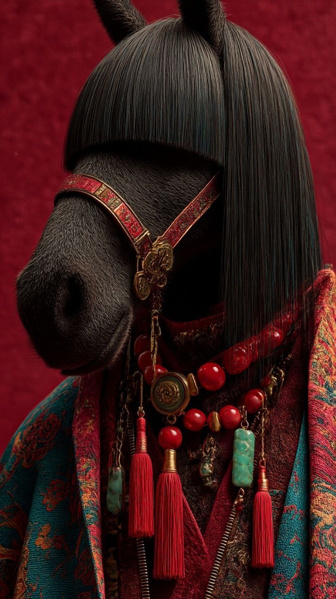 necklaces) around its neck. It has an exaggerated, thick straight bangs hairstyle that covers the forehead. The background is a solid deep red color, high-contrast, hyper-detailed, vibrant colors, realistic fur texture, fashion editorial style, --chaos 30 --ar 9:16 --raw --stylize 300 --draft #Нейросолнце@neo_neurosun #Midjorney