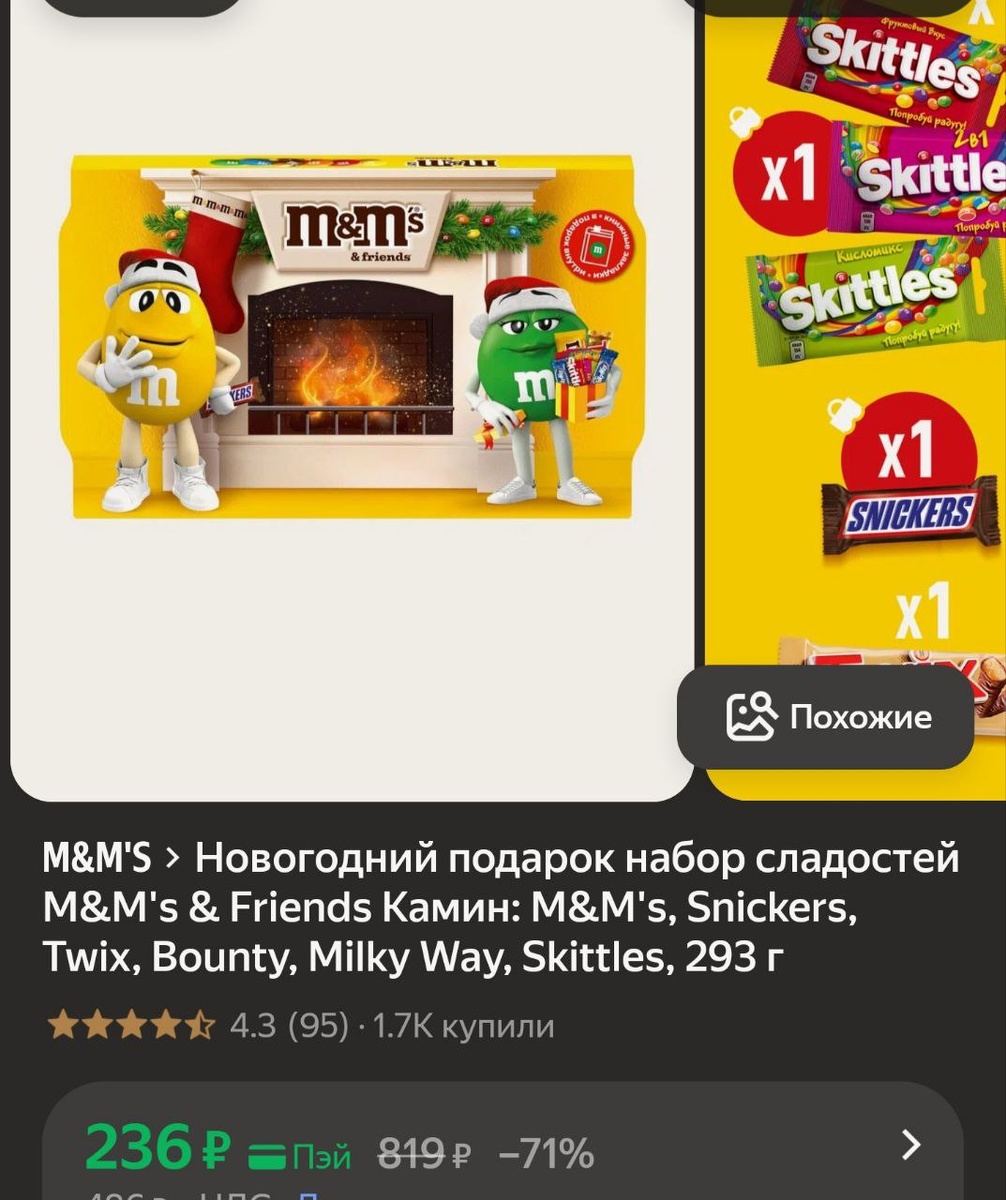 π»ΠΠΎΠ²ΠΎΠ³ΠΎΠ΄Π½ΠΈΠΉ ΠΏΠΎΠ΄Π°ΡΠΎΠΊ Π½Π°Π±ΠΎΡ ΡΠ»Π°Π΄ΠΎΡΡΠ΅ΠΉ M&M's & Friends ΠΠ°ΠΌΠΈΠ½: M&M's, Snickers, Twix, Bounty, Milky Way, Skittles, 293 Π³ - 236Ρ (Ρ.ΠΏΡΠΉ)