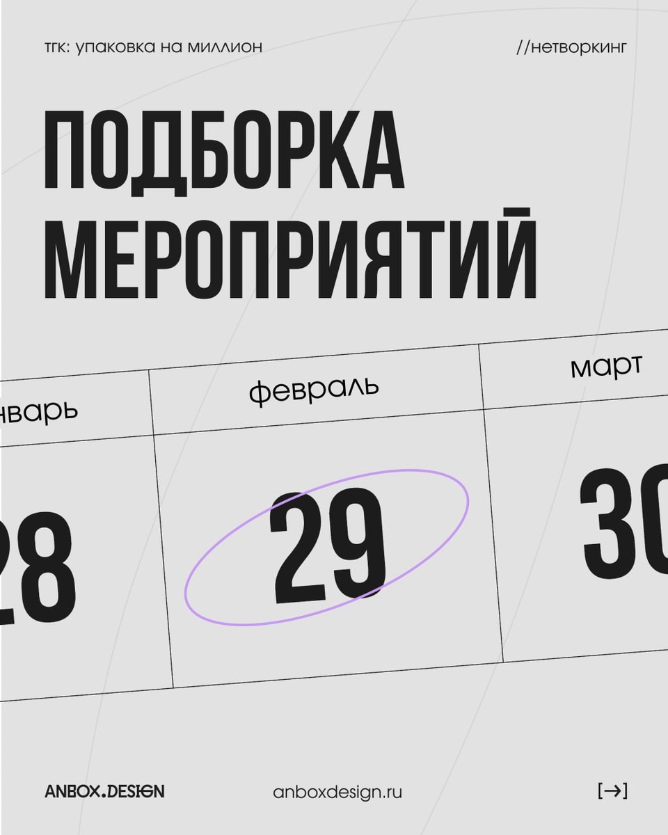 team lead anboxdesign.ru больше полезного в моем телеграмм-канале https://t.me/anboxdesign ЯНВАРЬ 2026 ▫️UPAKEXPO 2026 — 27–30 января 2026 — Москва — международная выставка — https://upakexpo.ru/ Выставка по масштабу не дотягивает до «Росупак», но можно заехать, если будете рядом ФЕВРАЛЬ 2026 ◾️Продэкспо-2026 — 9–12 февраля 2026 — Москва — международная выставка — https://www.prod-expo.ru/ Одна из крупнейших выставок FMCG. Представлены как федеральные производители,