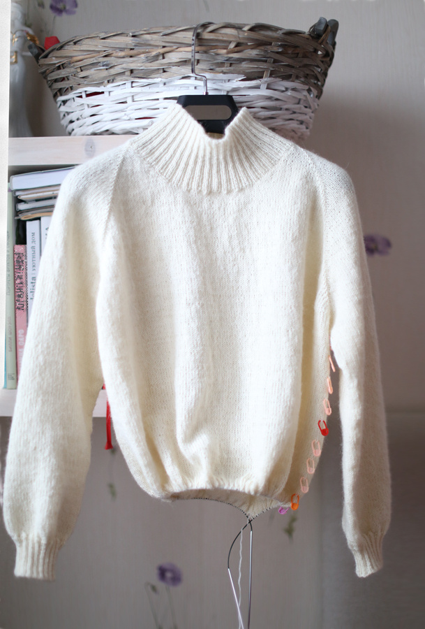 В хозяйстве Алесьино вязальные культуры не убраны с площадей Зала, Кухни и Спальни. Наибольшему распространению недовязанных свитеров подвержены горизонтальные поверхности Зала, что составляет 2/3 всего объёма. Мешок белой пряжи Флора Дропс освоен до дна, что составляет в первоначально-оприходованном весе 2 жалких остатка или 195% плана. Озимые культуры, представленные Белым свитером, растут хорошо и почти готовы к сбору урожая: Подсчёт оприходованной пряжи не окончательный, так как свитер отвязан до нижней резинки в количестве 6-7 рядов (что составляет 98% плана), и далее следует мучительный этап вязания резинки спицами №2,5 в количестве 22 круговых ряда с последующим закрытием иглой. Особых трудностей во время вязания не отмечено, окромя подскакивания полотна по высоте. Провязанные ряды за ночь подвергались неведомым метаморфозами и к утру укорачивались до неприличных состояний. В хозяйстве было решено не обращать на это внимание и ожидать купания в трёх котлах. Зелёный свитер Герн