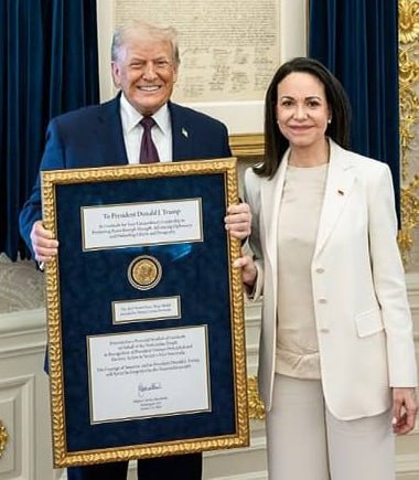 ⚡️15 января 2026 года лидер венесуэльской оппозиции Мария Корина Мачадо вручила президенту США Дональду Трампу свою медаль Нобелевской