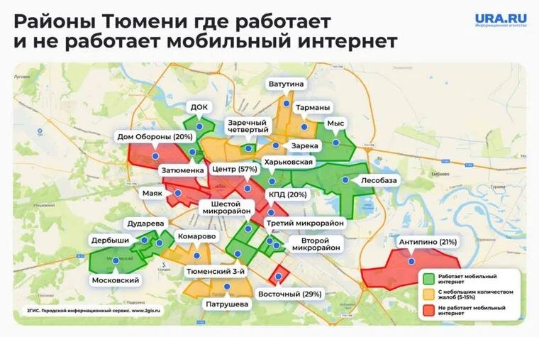 👀 В Тюмени с ноября в некоторых районах городах не работает мобильный интернет, а, например, в Антипино наблюдаются и проблемы со связью. Больше всего претензий у горожан к центру — 57% Журналисты подготовили карту с местами, где можно и нельзя выйти в интернет с телефона. 👉 «Зеленая» зона По словам тюменцев, в некоторых микрорайонах, несмотря на ограничения, мобильный интернет есть. В «зеленую» зону попали ДОК, Затюменка, Мыс, Дударева, Европейский, Харьковская, участок Восточного округа и Лесобаза. 👉 «Желтая» зона Горожане уверяют, в каких-то частях Тюмени интернет работает в зависимости от оператора. Например, меньше всего жалоб (5-15%) поступает из Зареки, Ватутина, Тарман, Комарово, Патрушево. 👉 «Красная» зона Центр стал самым «отключенным» районом. Также жители Антипино говорят, что перебои с интернетом длятся около трех месяцев. Большинство опрошенных рассказали, что они не могут пользоваться услугами и в Восточном, Маяке, КПД, Доме Обороны. 🫦 Злой Тюменец (блог адми