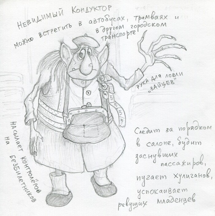 Решил тут на праздничных выходных карандашом почеркать, а то совсем уж забывать начал, как на бумаге рисовать - всё планшеты да фотошопы... Рисовал-рисовал, да как-то неожиданно придумал маленькую серию рисунков. * * *. Все знают, что раньше на Руси верили во всяких там леших, домовых, кикимор, банников. Но это когда было-то? Сейчас уж никто и не вспомнит, что такое овин, не говоря уже об овиннике в нём обретавшем. Настали новые времена, а с ними пришла и новая русская нечисть. Невидимый Кондуктор. Заводятся невидимые кондукторы в автобусах, трамваях, троллейбусах, поговаривают даже, что их можно встретить в метро, но тут не скажу - в Перми метро нет, проверить не могу. Бродят они среди пассажиров, следя за порядком в салоне. Будят заснувших пассажиров, успокаивают ревущих детей, насылают порчу на хулиганов и контролёров на "зайцев". Увидеть невидимого кондуктора можно, если смотреть на отражение салона в окне. Только не прямым взглядом, а боковым! Тогда вы наверняка заметите маленькую