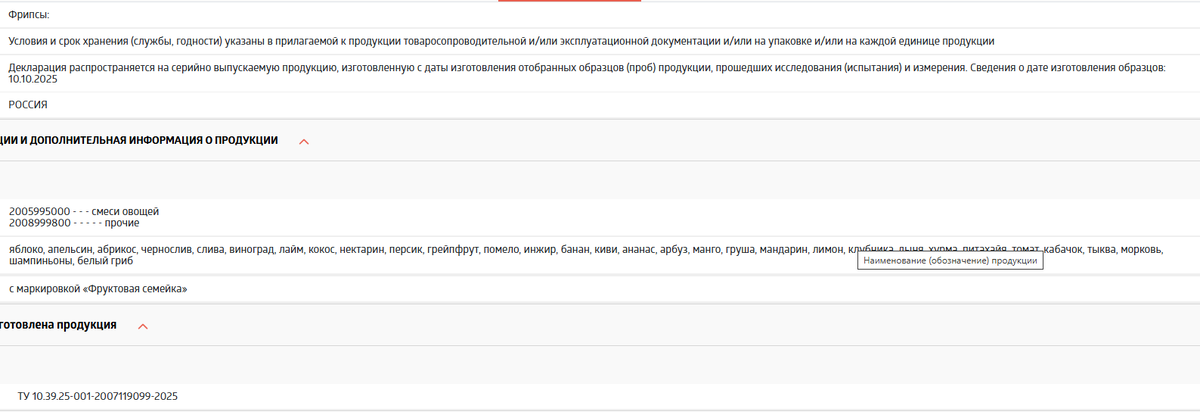 Использованы коды с высокой детализацией (например, для конкретного вида ореха) для общих описаний, что указывает на копирование кодов без понимания. - Указание "производство в квартире": В декларации прямо указано место производства - жилое помещение. Производство пищевой продукции в квартире запрещено СанПиН и не может быть легализовано для массового оборота. Любой проверяющий аннулирует документ на этом основании.
