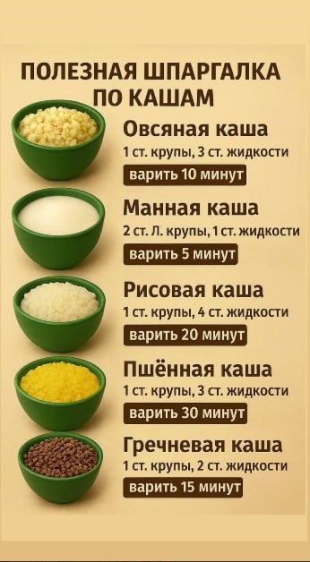 🍽 ПОЛЕЗНАЯ ШПАРГАЛКА ПО КАШАМ: СОХРАНИТЕ, ЧТОБЫ НЕ ПЕРЕСПРАШИВАТЬ 🔥 Правильные пропорции — и каша всегда идеальная 👌 🥣 Овсяная каша 1 ст. крупы + 3 ст. жидкости ⏱️ Варить 10 минут 🥣 Манная каша 2 ст. л. крупы + 1 ст. жидкости ⏱️ Варить 5 минут 🥣 Рисовая каша 1 ст. крупы + 4 ст. жидкости ⏱️ Варить 20 минут 🥣 Пшённая каша 1 ст. крупы + 3 ст. жидкости ⏱️ Варить 30 минут 🥣 Гречневая каша 1 ст. крупы + 2 ст. жидкости ⏱️ Варить 15 минут ✨ Итог: Никакой «на глаз» — только вкус и идеальная консистенция. @pomosnica #Лайфхак