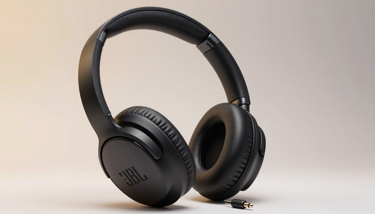 A close-up view of high-quality wireless headphones, prominently featuring the JBL Tune 770 NC model in sleek black, takes center stage. In the foreground, focus on the headphones resting on a polished wooden table, with a mini jack 3.5 mm connector showcased beside them. The middle layer captures vibrant sound waves visually represented in dynamic colors, swirling around the headphones, symbolizing rich audio quality. In the background, soft bokeh lights mimic a cozy, music-filled environment, suggesting relaxation and enjoyment. The lighting is warm and inviting, creating a professional yet inviting atmosphere. The perspective is slightly angled from above, emphasizing both the headphones and the sound waves, conveying a sophisticated technology mood.