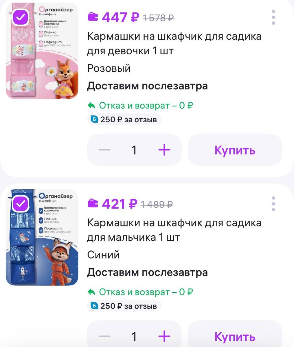 Кармашки на шкафчик для садика https://www.wildberries.ru/catalog/624331686/detail.aspx?size=846430777 https://www.wildberries.ru/catalog/624319230/detail.aspx?size=846416662 ✅ Канал по скидкам 🔣 Бот с промокодами
