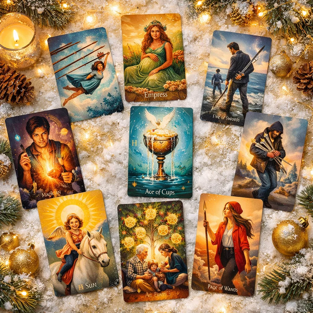 Карты: Тройка жезлов · Девятка мечей · Влюблённые · Паж пентаклей