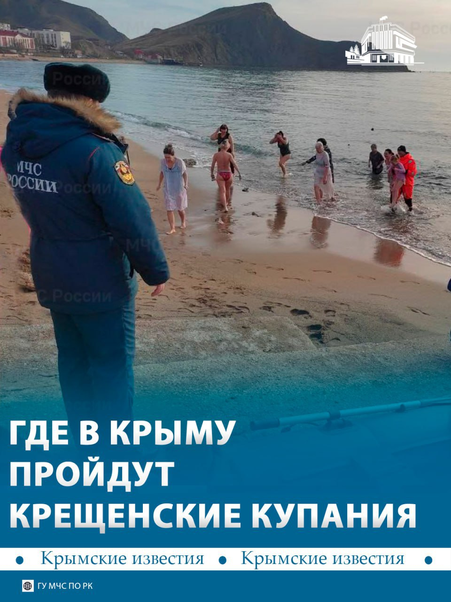 🌊 Крещенские купания проведут в 7 городах и 5 районах Крыма. Всего в этом году в регионе оборудовали 29 купелей. На локациях обеспечили все меры безопасности, а во время массовых омовений будут дежурить спасатели, сообщили в республиканском главке МЧС. Где можно будет окунуться ⬇️ ▪️ В Белогорском районе 2 купели будут доступны в Свято-Троицком Параскевиевском Топловском женском монастыре в селе Учебное ▪️ В Бахчисарайском районе – Мраморное озеро у села Скалистое и ставок недалеко от села Шевченково ▪️ В Сакском районе окунуться можно будет на пляже «Палуба» в селе Новофёдоровка ▪️ В Нижнегорском – в купели Святого Луки Крымского на побережье озера Сиваш в селе Изобильное ▪️ В Старом Крыму купель оборудовали в храме Успения Пресвятой Богородицы ▪️ В Алуште будут доступны центральный пляж, а также пляж села Малореченское ▪️ В Керчи – городская набережная ▪️ В Евпатории – пляж «Оазис» возле остановки трамвая №1 ▪️ В Судаке спасатели будут дежурить на городском пляже СУ-13, а также на п