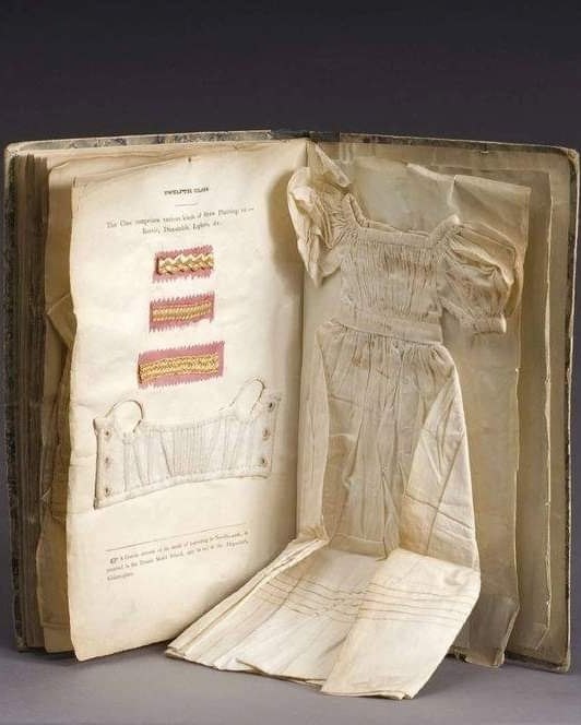 На снимке от ivyStars показана редкая книга по рукоделию с образцами шитья, вышивки, вязания и даже миниатюрной одежды. Такую сделали в Дублине в 1833 году.