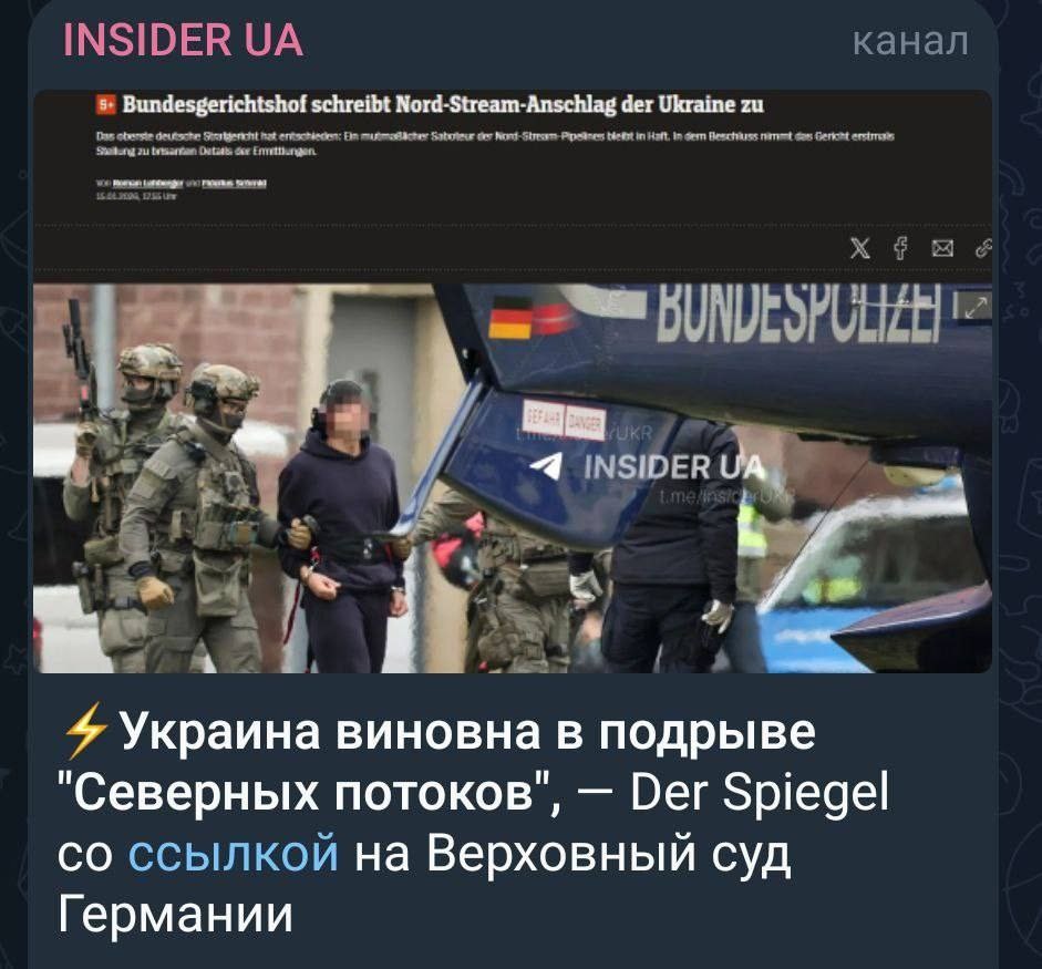 Spiegel: Федеральный суд Германии впервые публично обозначил версию о причастности Украины к подрыву «Северных потоков» Решение вынесено в рамках разбирательства по жалобе защиты одного из ключевых фигурантов дела — бывшего боевика украинских спецподразделений, арестованного в Европе. «Постановление вынесено на основании жалобы защиты Сергея К., бывшего члена спецназа украинской армии . К. находится под стражей в Германии после ареста в Италии в прошлом году», Защита пыталась выстроить линию аргументации вокруг международного права и статуса военного конфликта, настаивая на невозможности уголовного преследования. «Нападение было частью войны между Украиной и Россией, согласно международному праву, допускается повреждение инфраструктуры, важной для России», — утверждали адвокаты в своей жалобе, пишет издание. Федеральный суд Германии эту позицию отверг, указав на гражданский характер объекта и прямую связь с немецкими интересами. Суд оставил под стражей подозреваемого украинца Сер