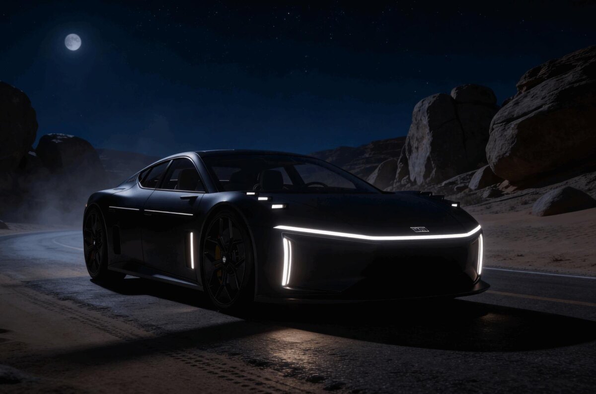 ночных поездок. Он оснащён сложной системой освещения с лидаром и вдобавок окрашен матовой чёрной краской с патентованной микротекстурой, которая поглощает рассеянный свет, снижает блики и сохраняет контрастность. Обводы кузова DarkSky One уменьшаю паразитную засветку и позволяют пассажирам видеть ночные пейзажи, обычно скрытые за яркостью фар. Светящиеся боковые полосы имеют антибликовое покрытие. Передняя оптика с технологией All Beam Adaptive Driving Light плавно регулирует яркость, подсвечивает повороты и меняет форму светового пучка в зависимости от дорожной обстановки. В рамках проекта DarkSky также дала свои рекомендации по улучшению автомобильного освещения. Например, предлагается установить максимальный порог яркости, сменить холодный свет на тёплый и усовершенствовать работу адаптивных систем, чтобы свет направлялся только туда, куда нужно водителю.
