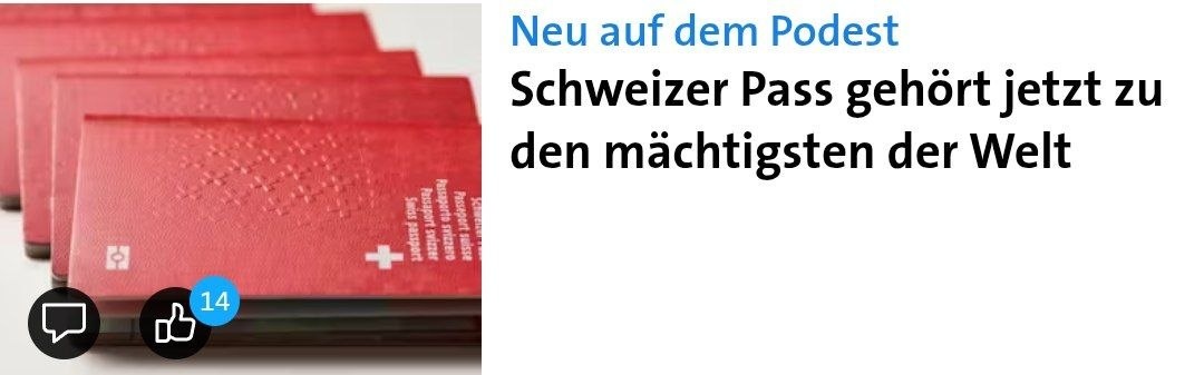 📌 " Швейцарский паспорт ещё никогда не занимал столь высокое место