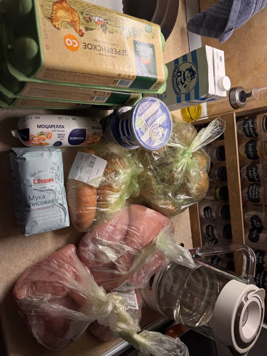 🫶🏼💫 Близятся выходные, а это значит, что пришло время делать закупку продуктов на следующую неделю. Вчера мы были допоздна на работе, и я на свой страх и риск заказала позднюю доставку продуктов домой. Привезли их, кстати, в пером часу ночи уже 😄 Обычно я заказываю базовые продукты оптом на доставке. Обычно это Лента. - филе индейки или курицы 5-6 кг; - сыр 1 кг моцарелла. Стараемся брать нежирный сыр 40%; - 2-3 упаковки безлактозного молока 1,5%; - 30-40 яиц; - мука рисовая 1 кг; - картофель 2 кг; - батат 1 кг; - картофель беби 1 кг; - пару баночек мягкого творога 2% на оладушки; - специи. По магазинам я обычно докупаю: рис, макарошки, овощи, фрукты. Иногда забегаю в осьминог за рыбой, морепродуктами, ягодами. На WB или OZON: арахисовая паста, пакеты для сувид, рисовая манка, заменитель сахара. А вы делаете запасы?😉