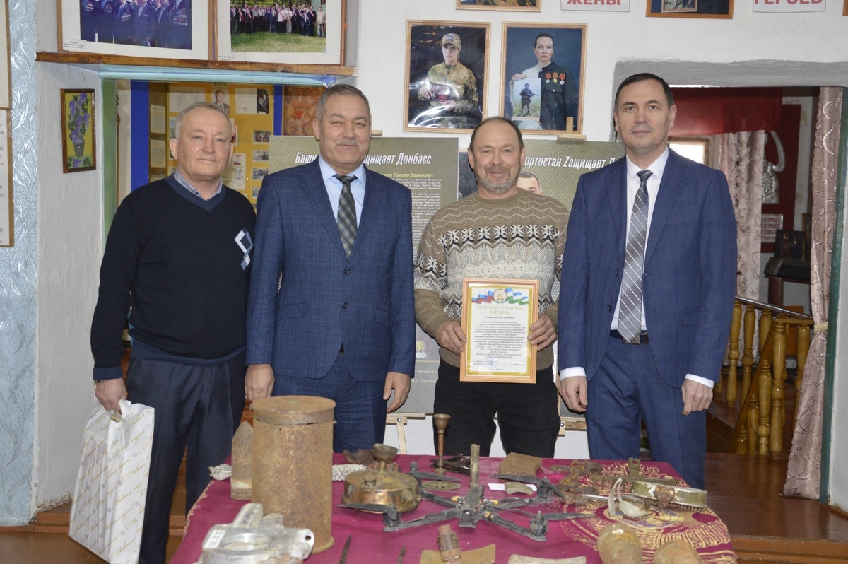 Сегодня, 16 января наш земляк Фадис Махиянов передал безвозмездно Караидельскому районному историко-краеведческому музею 22 предмета времен Великой Отечественной войны. В церемонии передачи артефактов приняли участие глава администрации МР Айдар Шайдуллин, его заместитель Рамиль Валинуров, исполнительный секретарь местного отделения Партии «Единая Россия» Эльза Султанова, представители СМИ и музея. Фонд музея ежегодно пополняется новыми экспонатами. Их в дар учреждению передают люди абсолютно разных возрастов, статусов и национальностей, за что директор Караидельского районного историко-краеведческого музея Тагир Муниров благодарен каждому из них. Он признается, что любит все коллекции, хранящиеся в музее. Выделить какой-то один предмет ему очень сложно. Историко-краеведческому музею Караидельского района 21 год. Он был открыт в селе Байки 21 ноября 2004 года в кирпичном доме купца Дмитрия Чечушкова, построенном в 1897 году. До 1931 года в здании располагалась Школа колхозной молодежи,