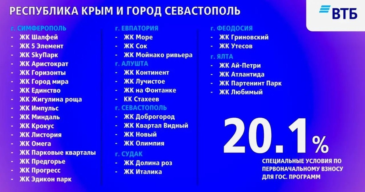 % Снова и снова слышу от вас вопрос: «А что реально купить в Крыму по Семейной ипотеке, если есть только 20% на взнос?» Отвечаю с цифрами и фактами ✅ Банк ВТБ активно финансирует стройки по всему побережью Крыма. Это значит, что многие новостройки уже одобрены банком — и вы можете получить ипотеку на них с минимальным первоначальным взносом от 20,1% по льготным программам. Где именно? 🌄 Алушта, Ялта, Судак — для тех, кто хочет горы, природу и галечные пляжи. Высокий спрос, отличная инвестиция. 🏖️ Евапатория — песчаные пляжи, мелкое море, идеально для семей с детьми. ✈️ Симферополь — если нужна транспортная доступность и до моря не больше 1,5 часов. Что это даёт вам? ✔️ Больше шансов на одобрение — банк “знаком” с этими ЖК. ✔️ Меньше вопросов по взносу — от 20,1% это реально. ✔️ Быстрые сделки — онлайн, без лишней бумажной волокиты. Я помогу: 🔹 Подобрать ЖК из списка ВТБ (пишите — вышлю актуальный перечень). 🔹 Правильно оформить заявку, чтобы повысить вероятность одобрения. �