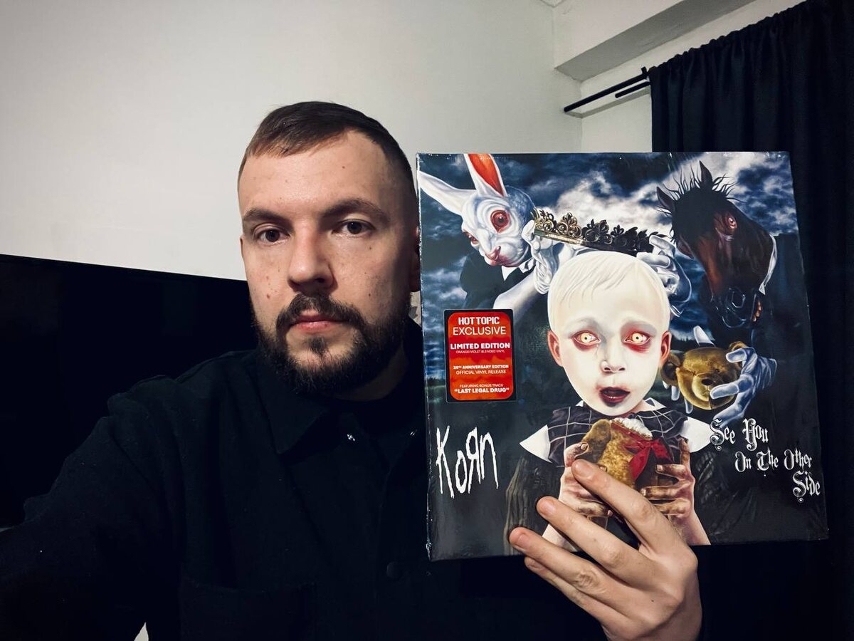 удивительным образом выдержали проверку временем. Наравне с Untitled (2007), он стабильно остаётся в плейлисте и время от времени возвращает в нужное состояние. Именно поэтому я не смог пройти мимо первого официального винилового издания, выпущенного к 20-летнему юбилею альбома. У меня в коллекции: Hot Topic Exclusive Limited Edition — Orange / Violet Blended Vinyl 20th Anniversary Edition Official Vinyl Release Два LP, впервые официально изданные на виниле, с бонус-треком “Last Legal Drug”, который раньше существовал лишь в расширенных CD-версиях. Сам прессинг выглядит достойно: плотный цвет, выразительный мраморный рисунок, и, что важно, отлично читается визуально — без ощущения «игрушечности», которой иногда грешат цветные релизы. See You On The Other Side — альбом переходного периода для Korn: уход от привычного звучания и попытка переосмысления собственного места в индустрии середины 2000-х. Можно по-разному относиться к этому этапу, но отрицать его значение в дискографии гр